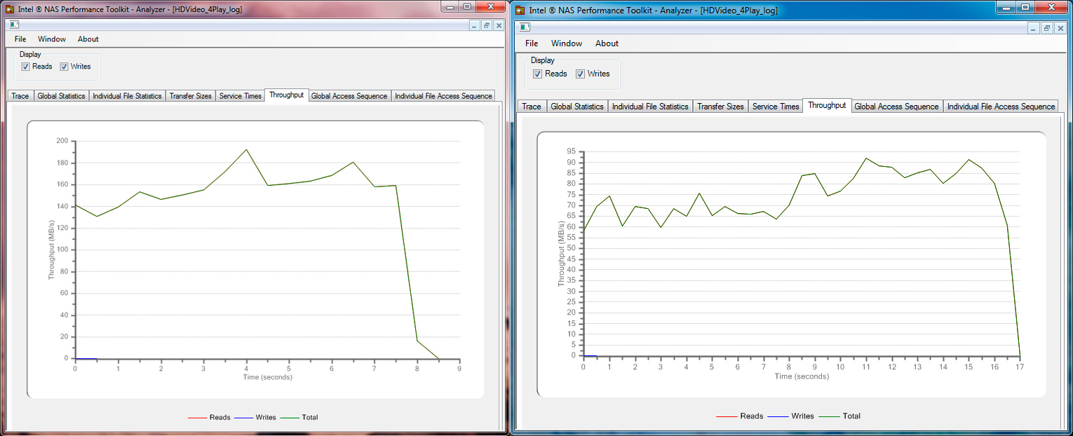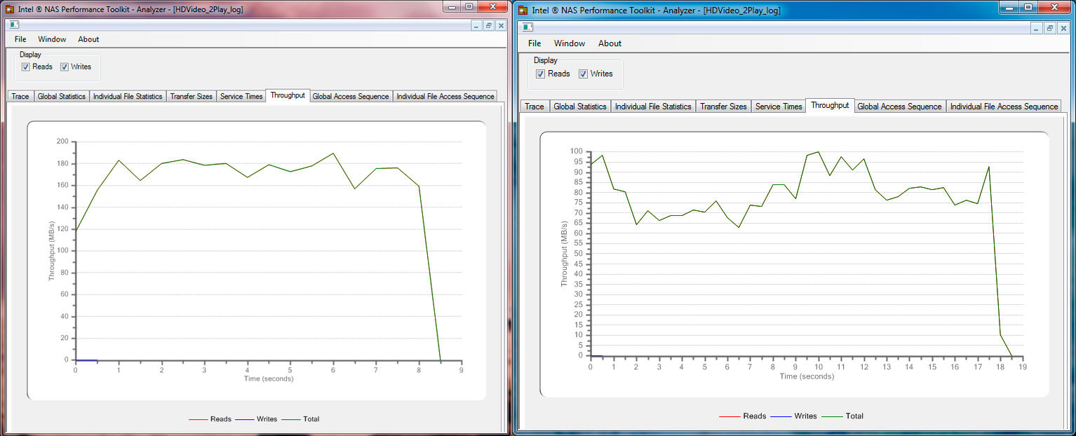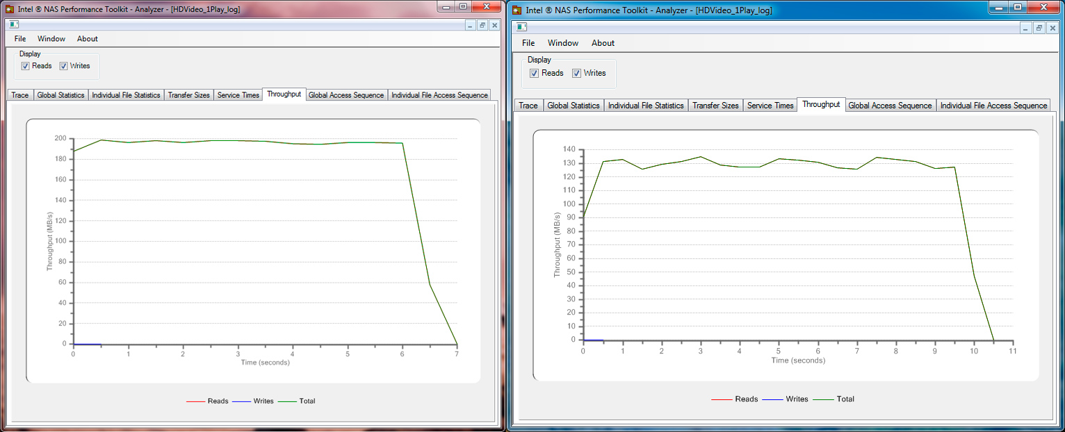 Следующий тест также демонстрирует существенную разницу между дисками, старший диск на крупных блоках достигает скорости передачи почти до 200 МБ/с, в то время младшая модель упирается в отметку 125 МБ/с.