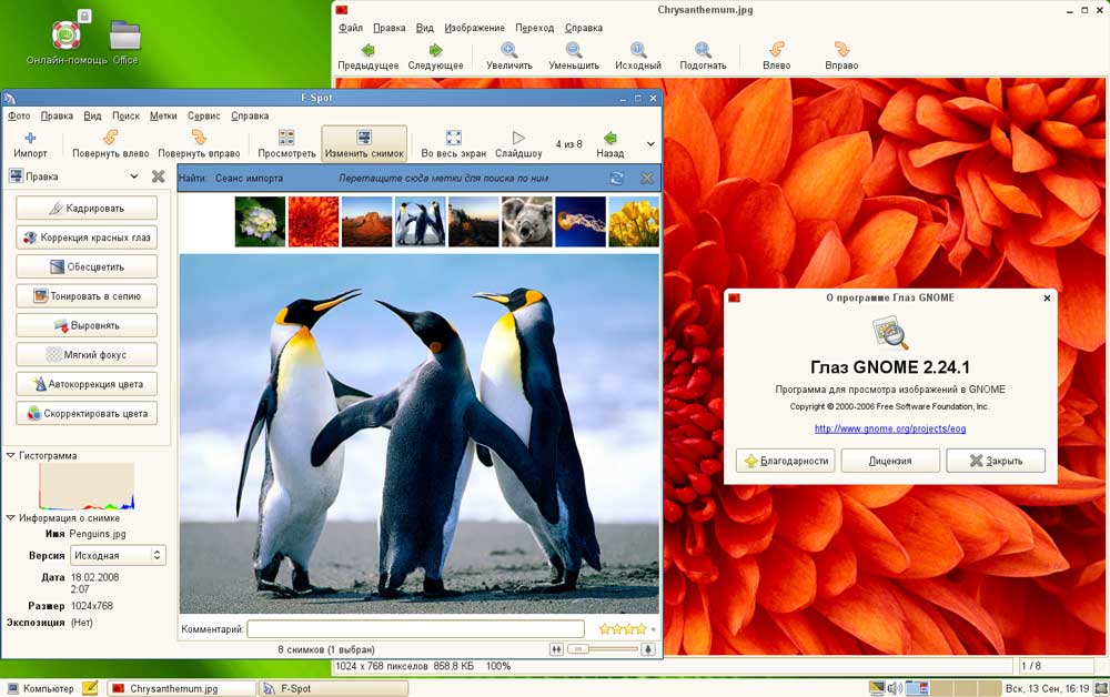 За базовую работу с изображениями отвечают уже хорошо знакомые нам Глаз Gnome и F-Spot, оба приложения отлично справляются со своими обязанностями, работают быстро и удобны в использовании.