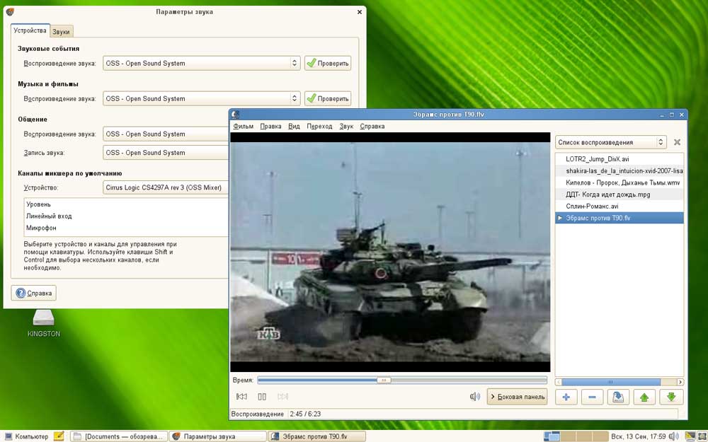 По окончании установки мы снова запустили mp3 файл, однако вместо музыки услышали... Точнее мы не услышали ничего, хотя картинка видеофайла исправно воспроизводилась. Опытным путем мы установили, что в настройках звука в Центре управления в качестве микшера надо выставить OSS, после чего проблем со звуком больше не было. Кроме того плеер Banshee не всегда корректно воспроизводил видео, выдавая иногда вместо картинки черный экран, с видеоплеером Totem, также присутствующим в комплекте, таких проблем не возникало и мы сделали его видеоплеером по умолчанию.