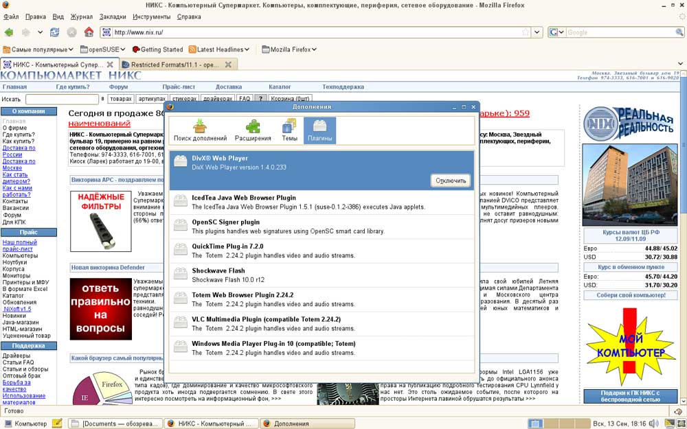 OpenSUSE традиционно укомплектован браузером Firefox версии 3.0.13, который ничем не отличается от своей Windows версии. Порадовало что при установке кодеков автоматически установился весь пакет необходимых расширений для работы с мультимедиа на веб-страницах, хотя до этого браузер сообщал нам, что необходимо установить недостающие плагины.