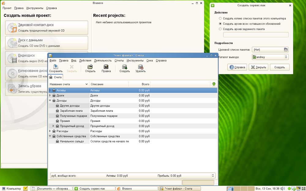 Для записи дисков предназначена уже знакомая нам Brasero, прекрасно справляющаяся со своими обязанностями. Кроме того мы проверили программу для учета домашних финансов GNUcash 2.27 однако сочли ее слишком путаной и неудобной. Зато нам понравилась утилита Создание сервис-паков, с помощью которой можно создать архив всех установленных на машине пактов или их части. Для этого сначала нужно создать копию списка пакетов пользуясь верхним пунктом, затем можем отредактировать его в текстовом редакторе, оставив только необходимые пакеты. Затем на основе нашего листа формируется архив, который можно установить на целевой машине не имеющей, например, доступа в интернет.