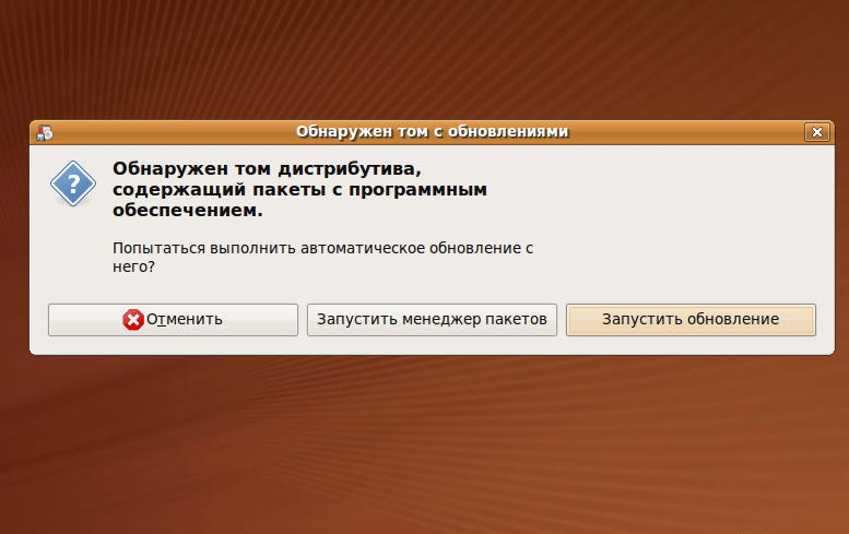 Исходя из вышеизложенного мы загрузили т.н. Alternate CD, который позволяет как обновить систему, так и выполнить чистую установку в текстовом режиме. После загрузки записанного диска в дисковод Ubuntu 9.04 самостоятельно определила наличие диска с новой версией системы и предложила запустить обновление.