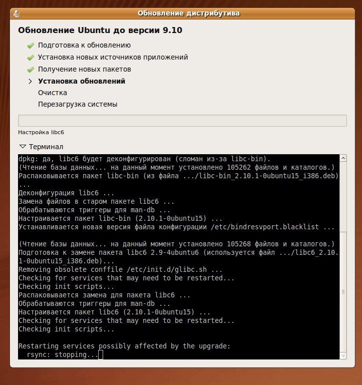 По окончании загрузки новых пакетов, которая при нашем мегабитном канале заняла около 40 минут, начнется установка обновлений, мы можем щелкнуть на Терминал и самостоятельно контролировать ход процесса, либо оставить все как есть и отправиться варить кофе.