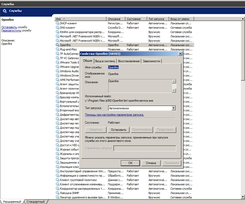 После чего перейдем в оснастку Службы и убедимся, что служба Openfire создана, работает и имеет автоматический тип запуска.