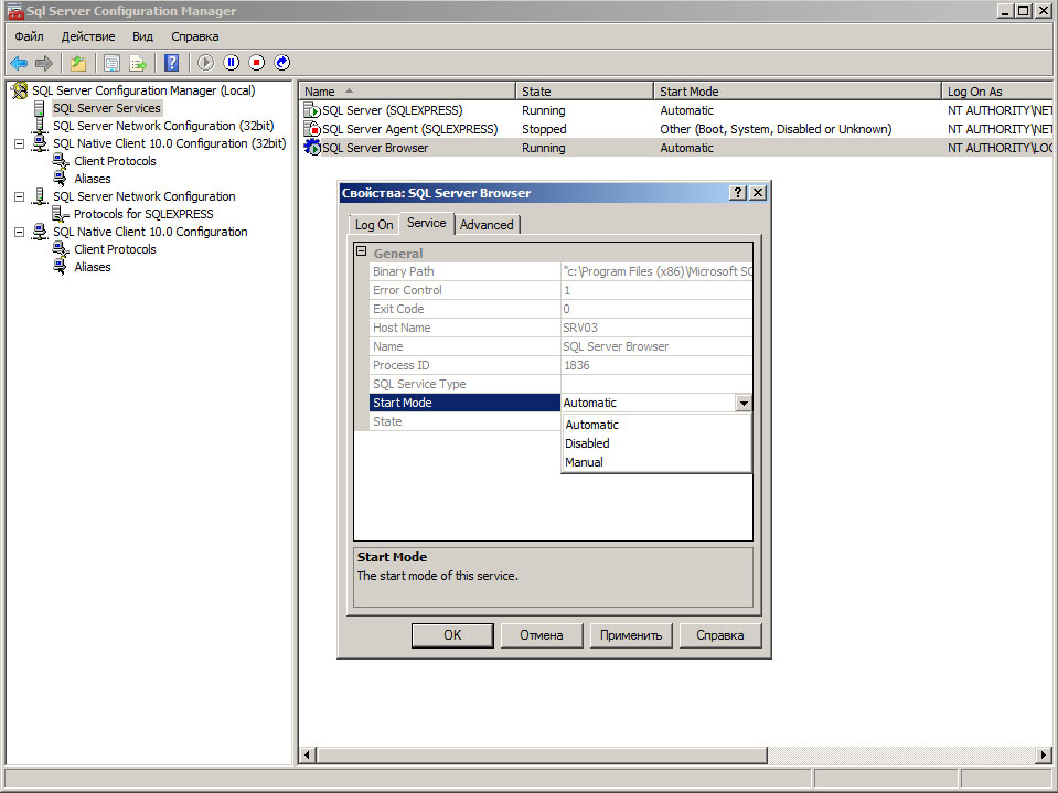 Сразу после установки идем в SQL Server Configuration Manager и проверяем состояние службы SQL Server Browser. При установке по умолчанию она остановлена. Заходим в свойства и устанавливаем для нее автоматический тип запуска, после чего запускаем.