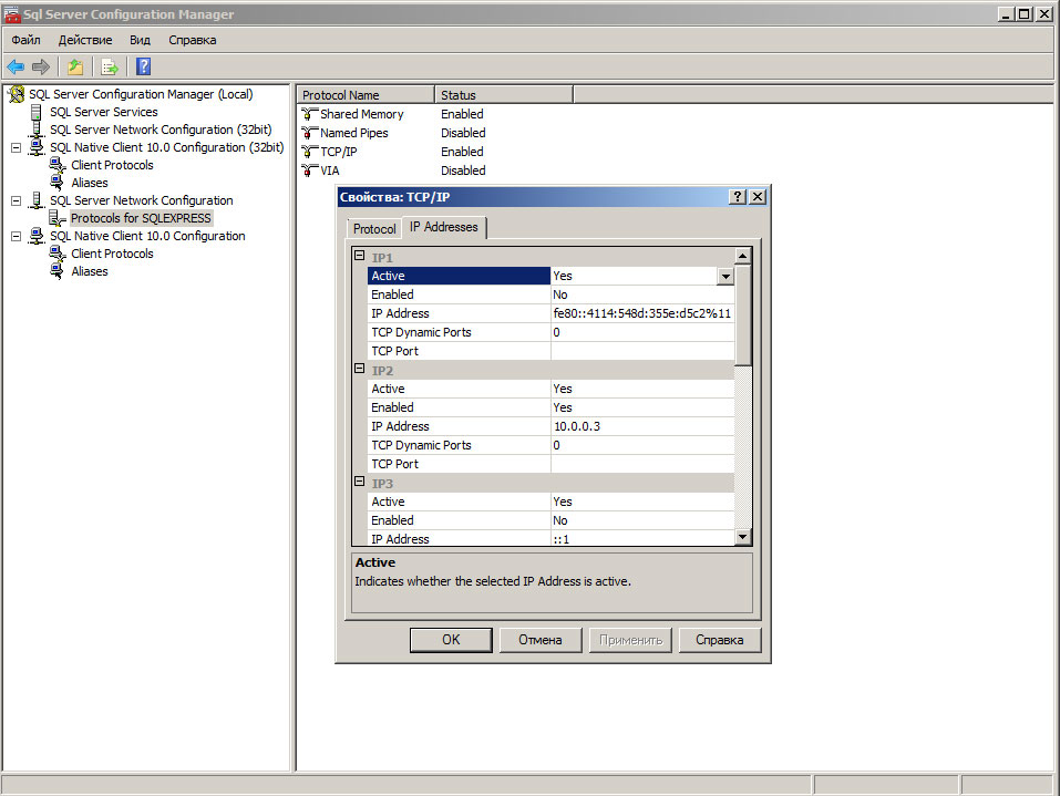 Затем переходим в SQL Server Network Configuration и включаем протокол TCP/IP, не забываем перейти на закладку IP Adresses и явно включить использование протокола для нужных интерфейсов (127.0.0.1 и 10.0.0.3).