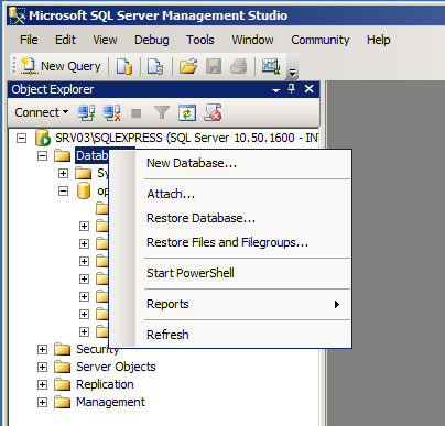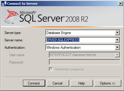 Теперь создадим новую БД, для этого откроем SQL Server Management Studio, обратите внимание что для входа нужно использовать имя_хоста\имя_экземпляра_SQL, в нашем случае SRV03\SQLEXPRESS.