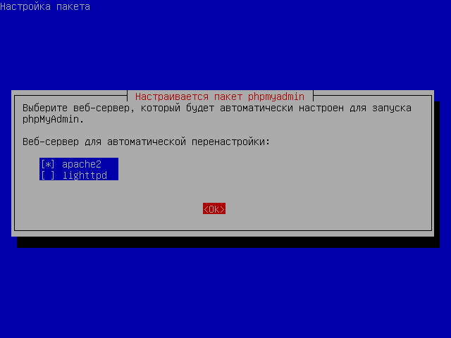 Установщик пакета предложит автоматически сконфигурировать веб-сервер, не забудьте отметить необходимый тип сервера (в нашем случае apache2) перед тем как продолжить.