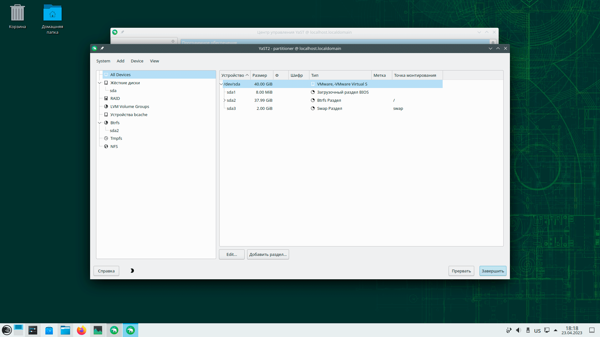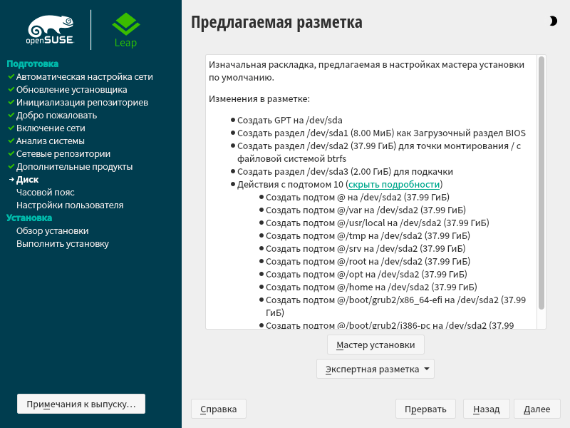 Одной из отличительных черт SUSE является использование файловой системы btrfs по умолчанию: