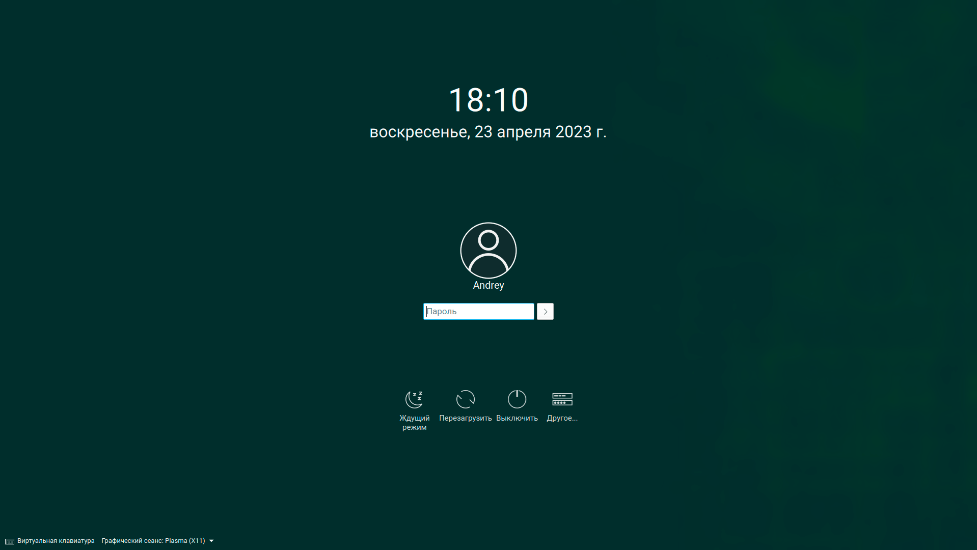 После завершения установки и перезагрузки нас встречает стандартное для KDE окно входа в систему в фирменных темно-зеленых тонах.