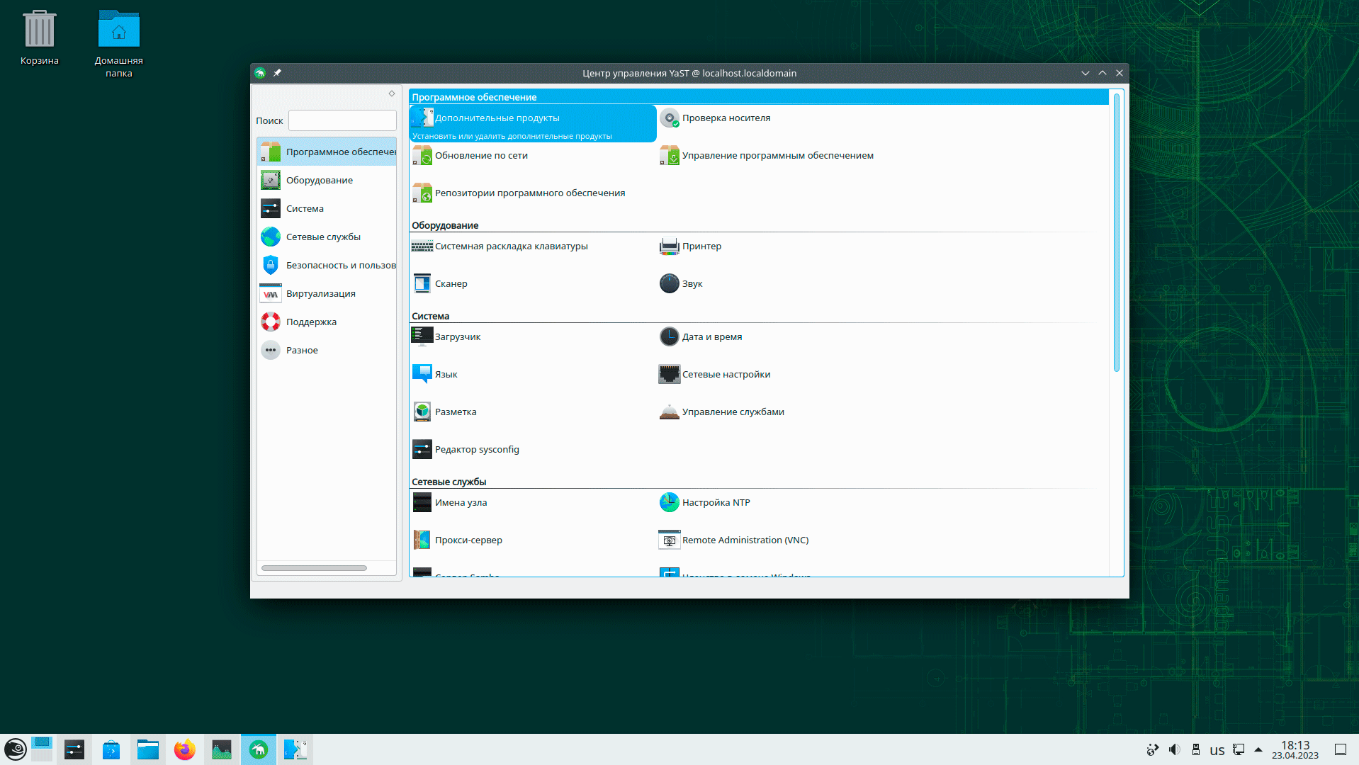 Админов старой закалки, несомненно, порадует то, что все программы ставятся из репозиториев, в чем не трудно убедиться при помощи того же YaST, для рабочего дистрибутива это в целом правильно, так как дает больший контроль над ПО в организации.