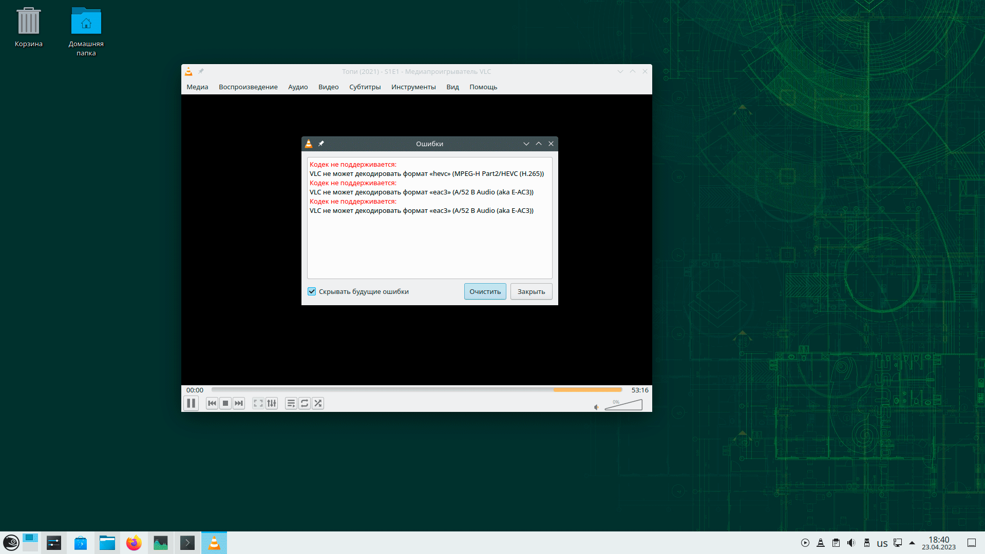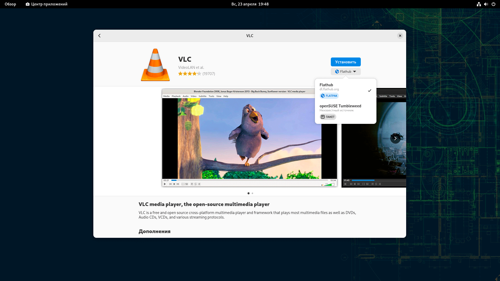 К современным универсальным пакетам можно относиться по-разному, но ряд вопросов они успешно решают. Так родной, из репозиториев, VLC проигрывать кино отказался, ссылаясь на отсутствие кодеков, а вот версия из Flatpak оказалась не такой принципиальной и все свое притащила с собой, включая, разумеется, кодеки.