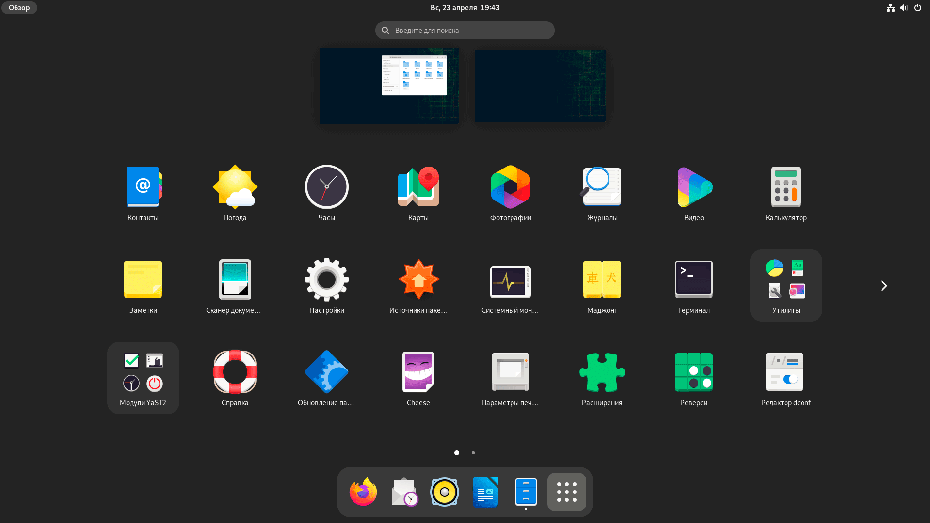 Для разнообразия мы поставили версию с GNOME и получили новейший GNOME 44 в его классическом виде, никакой тонкой настройки оболочки в дистрибутиве не производилось.