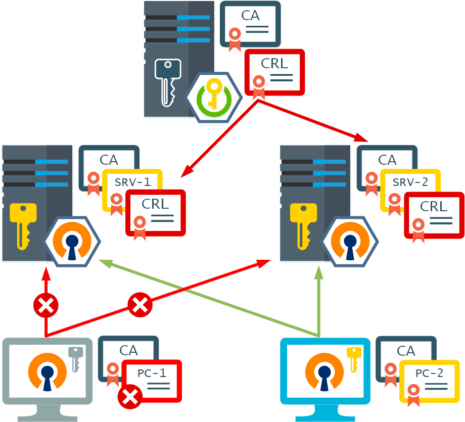 После того, как CA обновил список отозванных сертификатов (CRL) его нужно распространить на все сервера OpenVPN в нашей инфраструктуре, после чего они будут понимать, что данный сертификат отозван и отказывать в соединении. Если мы не выполним данное условие, то те сервера, которые не получили обновленный CRL будут по-прежнему разрешать доступ клиенту сертификат которого отозван.