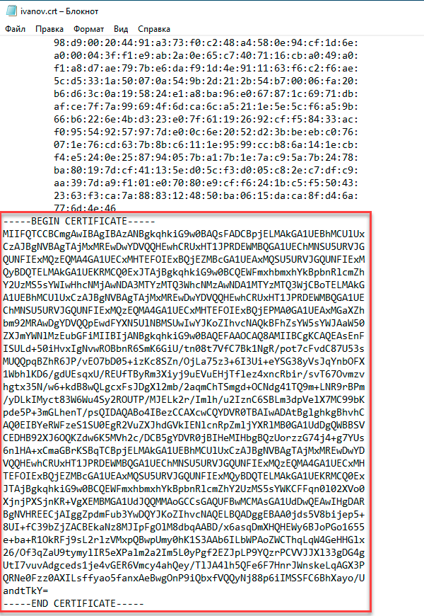 В секцию ca мы копируем содержимое корневого сертификата ca.crt, в секцию key - содержимое ключа клиента, а в секцию cert - открытый ключ из его сертификата, обратите внимание, что копируется содержимое начиная от строки BEGIN и заканчивая строкой END включительно, как есть, без каких либо изменений. Открыть сертификаты и ключи можно обычным Блокнотом, либо любым иным текстовым редактором.