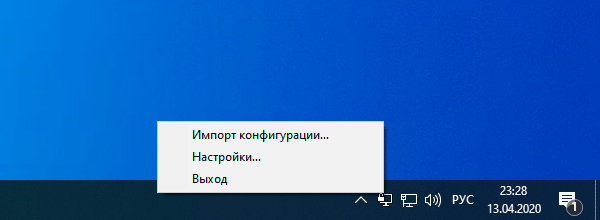 Теперь файл конфигурации можно сохранить и передать на клиентское устройство. А дальше все достаточно просто и практически не требует вмешательства администратора, многие пользователи вполне способны сделать все самостоятельно. Щелкаем правой кнопкой на значок графической оболочки OpenVPN в системном лотке, выбираем Импорт конфигурации и указываем на полученный файл.