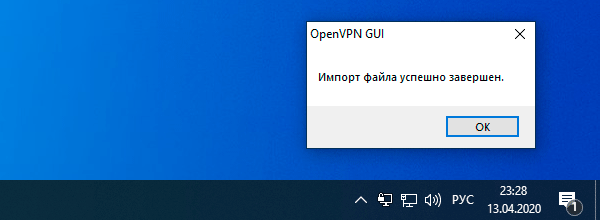 Если все сделано правильно, то вы получите сообщение об успешном импорте. Поздравляем, OpenVPN-клиент успешно настроен, можно переходить к следующему.