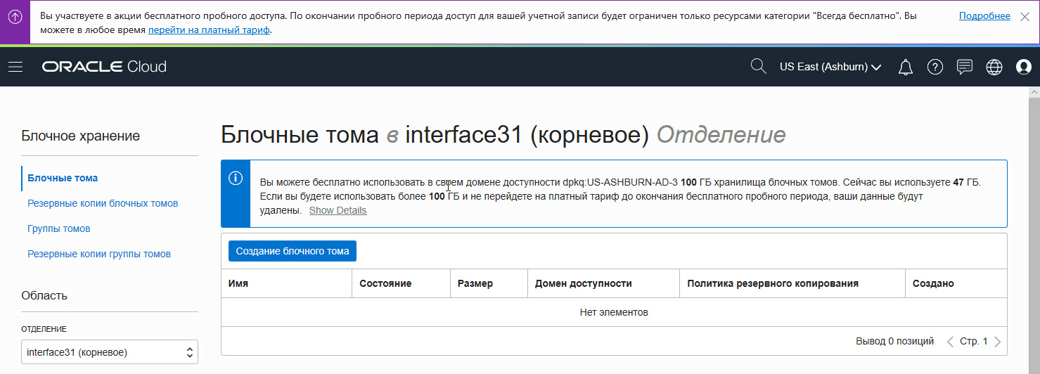 Вы можете бесплатно использовать в своем домене доступности 100 ГБ хранилища блочных томов. Сейчас вы используете 47 ГБ. Если вы будете использовать более 100 ГБ и не перейдете на платный тариф до окончания бесплатного пробного периода, ваши данные будут удалены.