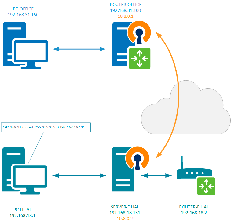 Мы специально не стали разворачивать для OpenVPN отдельную конфигурацию в наше лаборатории, а воспользовались уже существующими виртуальными машинами. В качестве сервера центрального офиса мы использовали роутер на базе Ubunutu Server 14.04 LTS, за которым находится сеть 192.168.31.0/24, в которой находится рабочая станция под управлением Windows 10. В филиале OpenVPN установлен на сервер с Debian 8, который принадлежит сети 192.168.18.0/24, в которой находится рабочая станция с Windows 8.1 и которая выходит в интернет через простой роутер начального уровня.