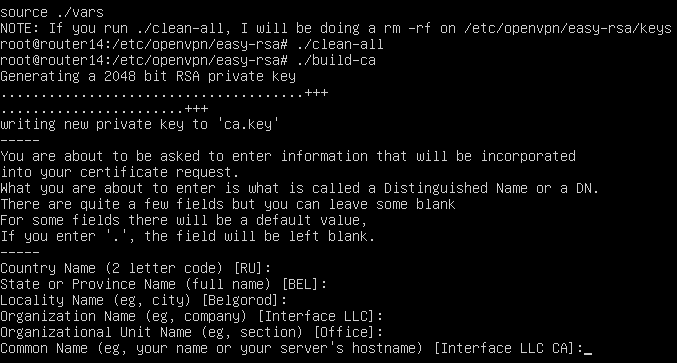 После выполнения данной операции в папке /etc/openvpn/easy-rsa/keys появятся файлы ca.crt и ca.key. Первый является сертификатом с публичным ключом и должен присутствовать на всех узлах OpenVPN сети, а файл с расширением .key - закрытый (приватный) ключ и доступ к нему должен быть ограничен. Файл ca.key нужен исключительно для работы центра сертификации и не должен никуда копироваться или передаваться, особенно по незащищенным каналам.