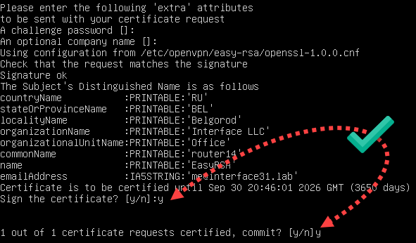 В процессе генерации вам также придется подтвердить параметры из файла vars, либо указать свои, в конце вы получите два вопроса о подписи и выпуске сертификата, на оба отвечаем утвердительно.