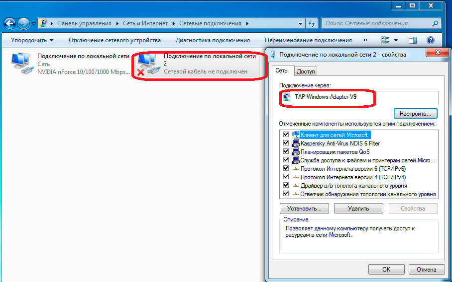 В процессе установки в систему инсталлируется виртуальный сетевой адаптер TAP-Win32 Adapter V9 и, соответственно, драйвер к нему. Этому интерфейсу программа OpenVPN как раз и будет назначать IP адрес и маску виртуальной сети OpenVPN. В нашем случае ему назначен адрес 10.10.10.1с маской 255.255.255.0 на сервере С_ОФ1 и 10.10.10.2 с аналогичной маской на клиенте С_ОФ2.