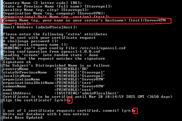 Важно! Указываем параметр "commonname" - пишем имя нашего VPN сервера. Все остальные параметры оставляем по умолчанию, на все вопросы отвечаем yes