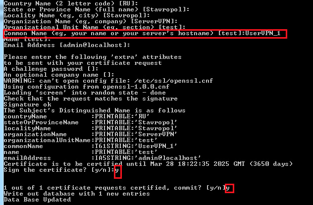 Важно! Указываем параметр "commonname" - пишем имя нашего VPN клиента(UserVPN_1). Все остальные параметры оставляем по умолчанию, на все вопросы отвечаем yes