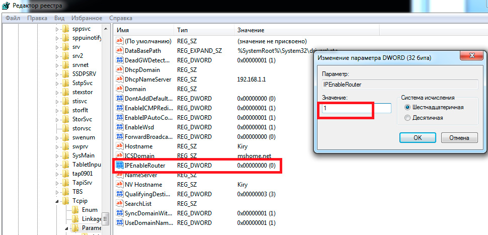 Находим параметр и меняем значение: IPEnableRouter типа REG_DWORD значение 1.