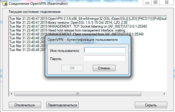Дальше нужно в конфиге клиента прописать строку auth-user-pass, теперь когда клиент будет подключаться к серверу у него будет выплывать окно авторизации где нужно ввести логин и пароль, который вы назначили ему в Users.pw,их нужно будет сообщить клиенту.
