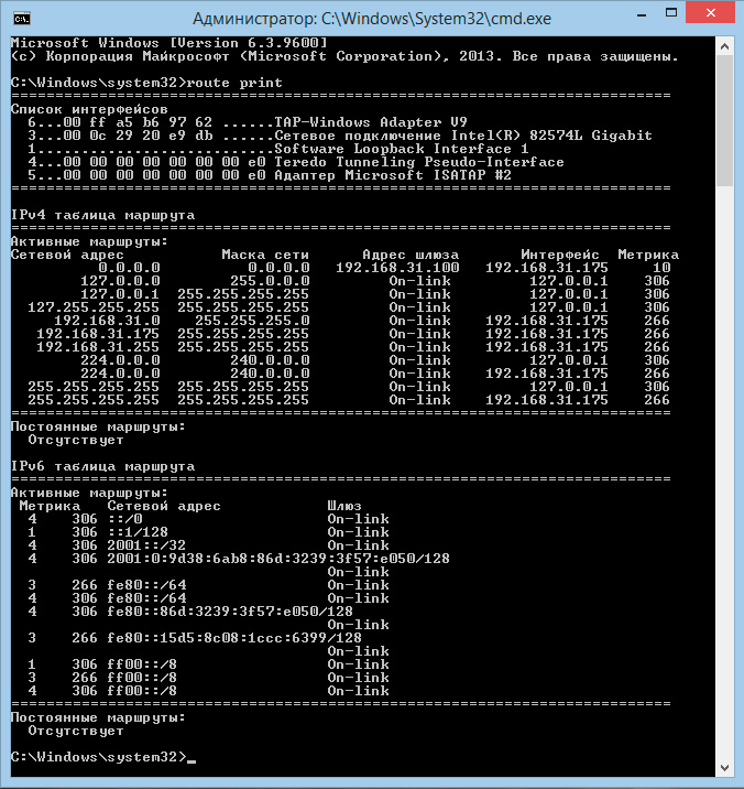 Чтобы не быть голословными рассмотрим таблицу маршрутов самой обыкновенной рабочей станции. В Windows системах это можно сделать командой: