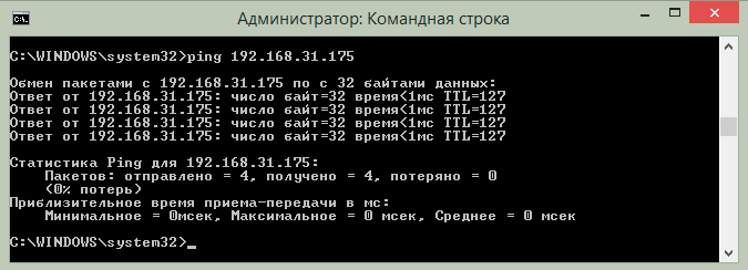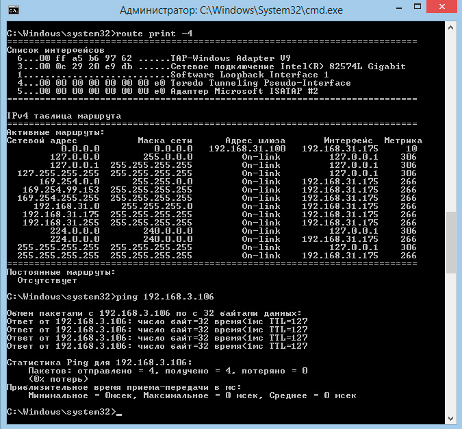 Самое время проверить, как это все работает. Попробуем с нашего узла 192.168.31.175 пропинговать узел 192.168.3.106, который находится в сети за роутером. Как видим, это нам удалось, хотя таблица маршрутов узла не содержит никаких сведений о сети 192.168.3.0.