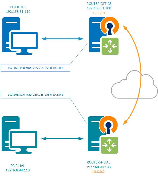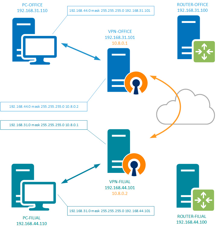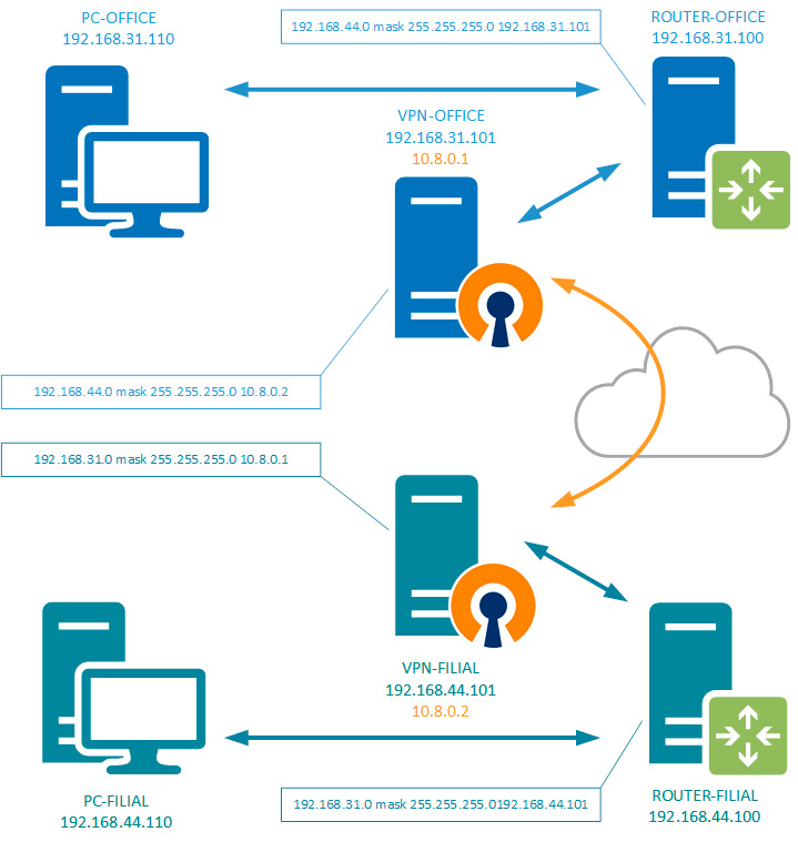 Теперь рассмотрим реальные примеры по объединению сетей офисов через VPN-соединение. Несмотря на то, что чаще всего для этих целей используется OpenVPN и в наших примерах мы также подразумеваем решения на его основе, все сказанное будет справедливо для любого типа VPN-соединения.