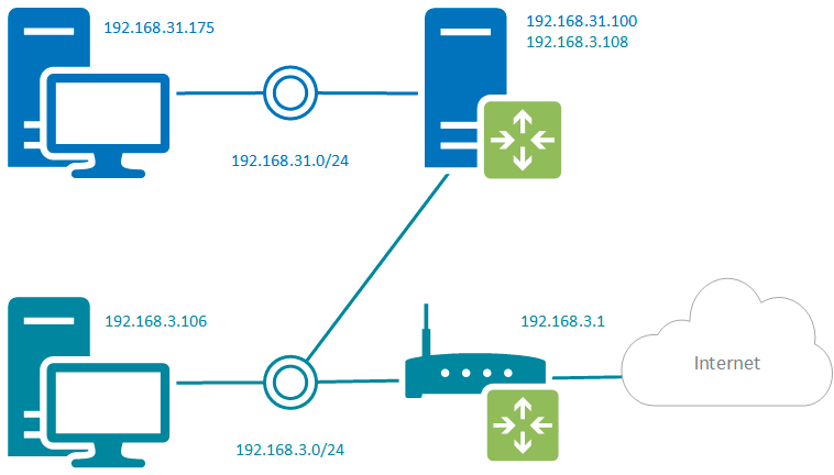 Недостаток данной схемы - необходимость прописывать маршруты на каждом узле сети, что не всегда удобно. Его можно использовать если устройств в сети немного или требуется выборочный доступ. В остальных случаях задачу маршрутизации будет правильнее переложить на основной маршрутизатор сети.
