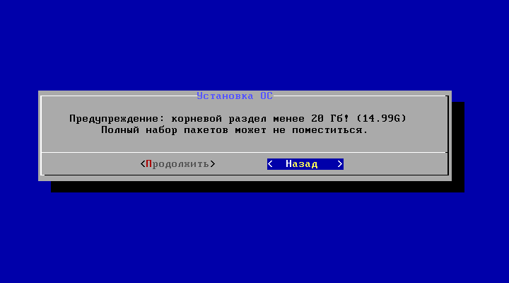 Если попытаться продолжить установку - то она завершится ошибкой, поэтому мы увеличили размер диска до 60 ГБ и начали все заново. Схема разбивки диска на разделы также вызывает вопросы: