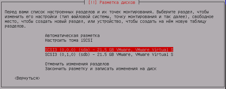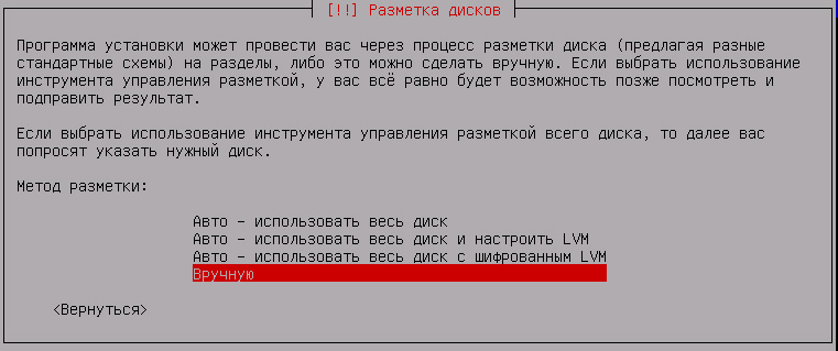 Мы не будем подробно рассматривать процесс установки, этот процесс подробно описан нами здесь, остановимся непосредственно на разметке дисков. Так как программный RAID создается на основе разделов, то диски необходимо предварительно разметить вручную, выбрав соответствующий пункт инсталлятора.
