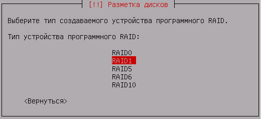 Затем переходим к Настройка программного RAID - Создать MD устройство и выбираем необходимый тип массива, в нашем случае RAID1 (зеркало).