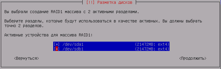 Следующими шагами указываем количество активных (для зеркала - 2) и резервных (если необходимо) разделов, после чего выбираем их.