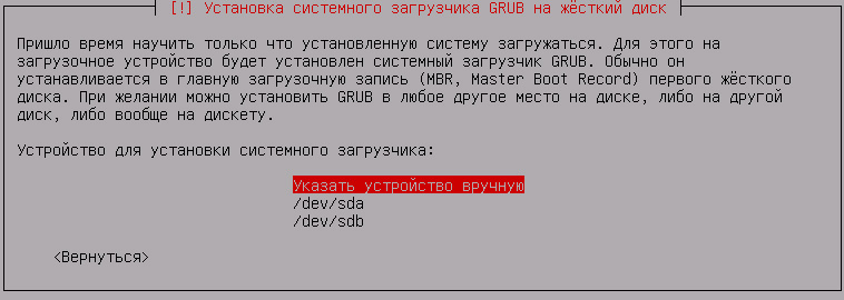 После чего продолжаем установку ОС привычным образом. В конце нас поджидает еще одна особенность: в отличие от Ubuntu, которая автоматически ставила загрузчик на все диски, Debian предлагает выбрать какой-то один диск. Вполне логично будет выбрать первый - sda, хотя принципиальной разницы нет, максимум - придется изменить в BIOS порядок загрузки.