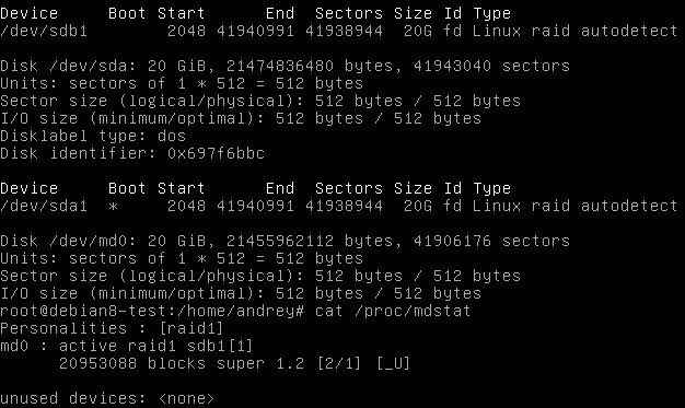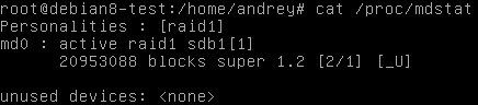 Как видим в строю остался только один диск - sdb, но система, как и положено, работает. Вернем диск на место и снова проверим состояние массива.