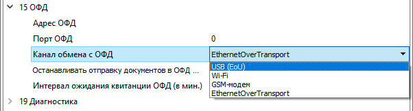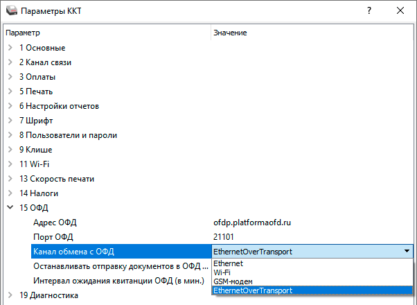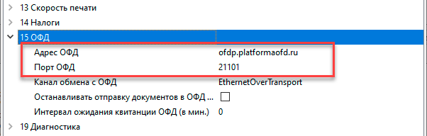 Сама же настройка EoT достаточно проста, вам потребуется указать в пункте 15 параметров ККТ адрес и порт используемого вами ОФД.
