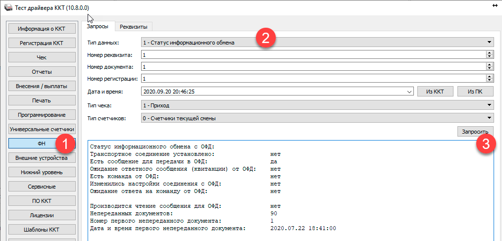 Будьте внимательны, отмечены случаи, когда порт ОФД сохранялся не с первого раза, поэтому рекомендуем тщательно проверять настройки перед началом эксплуатации кассы. Также можете пробить пробный чек, либо открыть или закрыть смену (проще говоря создать любой фискальный документ), а затем проверить состояние отправки документов в ФН - 1 -Статус информационного обмена. Количество непереданных документов должно быть равно нулю (на скриншоте отчет тестовой кассы с МГМ которая не осуществляет передачу данных).