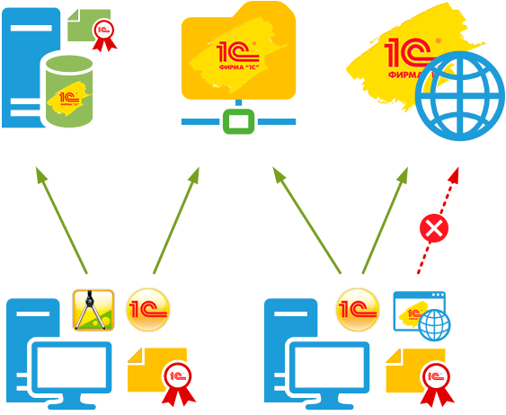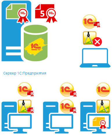 - Однопользовательские - позволяют запускать неограниченное число приложений в режиме тонкого и толстого клиентов, а также Конфигуратора на одном ПК.
