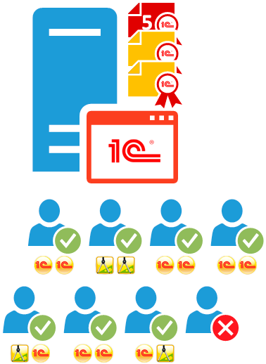 В большинстве случаев, особенно для небольших предприятий, использование однопользовательских лицензий является предпочтительным, потому как ограничением данного вида лицензии являются лицензируемые ПК, а не сеансы 1С. В файловом режиме это единственный доступный вид лицензии (кроме режима терминального сервера). Рассмотрим следующую схему: