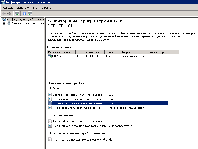 При неправильной настройке терминального сервера может возникнуть ситуация, когда на каждое новое подключение пользователя создается новый терминальный сеанс, особенно это касается режима RemoteApp, поэтому в настройках сервера терминалов обязательно укажите опцию Ограничивать пользователя единственным сеансом.