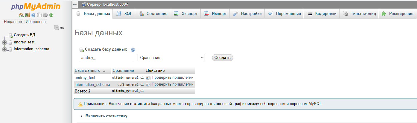 И выдадим полные права на базы с шаблоном имени andrey_basename, такой подход позволит автоматически давать права всем новым базам которые будет создавать пользователь.