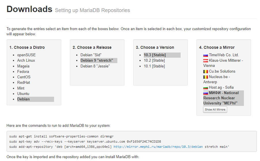 Сделана она очень удобно: вы выбираете свой дистрибутив, его выпуск, версию СУБД и зеркало - после чего получаете готовую инструкцию для установки. Чтобы сэкономить вам время приведем ее здесь (мы будем устанавливать MariaDB 10.3 на Debian 9):