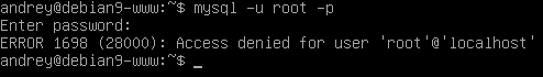 И здесь успеха у нас не будет. Отлично! Теперь доступ с правами суперпользователя СУБД имеет только суперпользователь системы и нам не нужно беспокоиться, что пароль root MariaDB станет известен кому-либо.