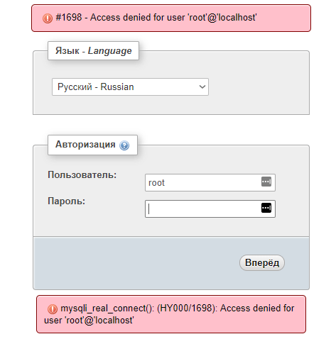 Несмотря на то, что система спросит нас пароль и мы его правильно введем - в доступе нам будет все равно отказано. Повторим попытку через phpMyAdmin: