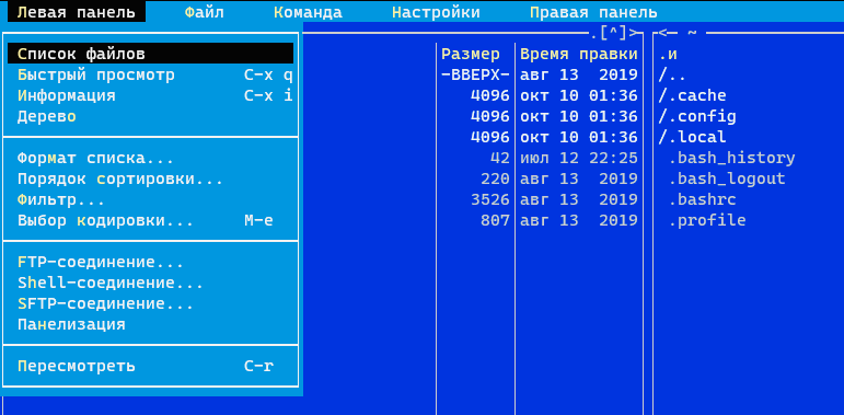 Разделы Левая панель и Правая панель верхнего меню идентичны и содержат настройки отображения панелей, также отсюда можно инициализировать внешнее FTP или SSH соединение, после чего панель будет отображать содержимое удаленного узла.
